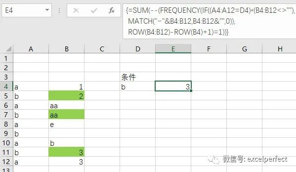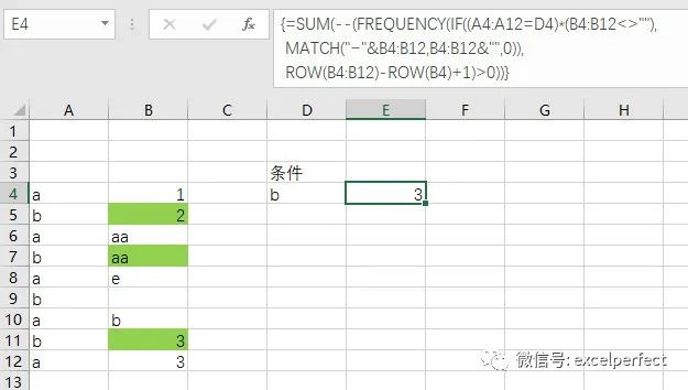 很显然,对应于字母b的不同值为2、aa和3,共3个。使用数组公式: