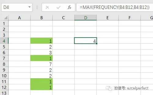 =MAX(FREQUENCY(B4:B12,B4:B12))