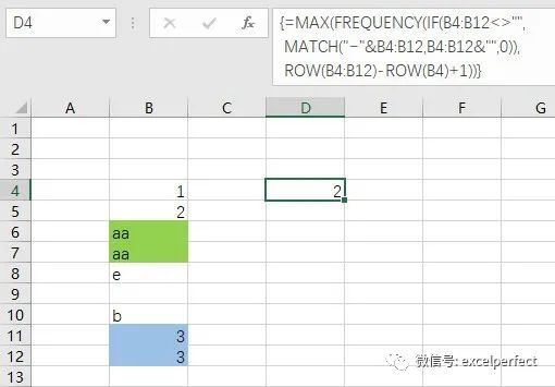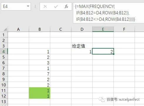 =MAX(FREQUENCY(IF(B4:B12=D4,ROW(B4:B12)),IF(B4:B12<>D4,ROW(B4:B12))))