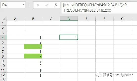 =MIN(IF(FREQUENCY(B4:B12,B4:B12)>0,FREQUENCY(B4:B12,B4:B12)))