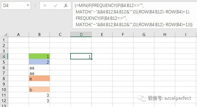 =MIN(IF(FREQUENCY(IF(B4:B12<>"",MATCH("~"&B4:B12,B4:B12&"",0)),ROW(B4:B12)-ROW(B4)+1),FREQUENCY(IF(B4:B12<>"",MATCH("~"&B4:B12,B4:B12&"",0)),ROW(B4:B12)-ROW(B4)+1)))
