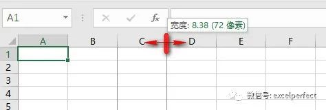 当我们将鼠标移动到工作表头列序号之间时,Excel会出现指向左右两侧的十字箭头,此时按下鼠标左键,会显示左侧列的列宽信息提示,如下图1所示,显示列C的宽是8.38(72像素)。
