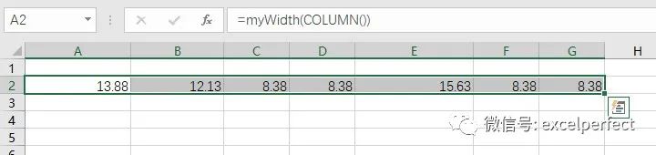 在单元格中,像普通的Excel工作表函数一样输入,获取该单元格所在的列的列宽,效果如下图2所示。