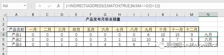 ADDRESS函数中的第一个参数值3代表标题行第3行,将3和MATCH函数返回的结果传递给ADDRESS函数返回非零值对应的标题行所在的单元格地址。然后,传递给INDIRECT函数得到该单元格地址对应的值。