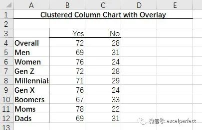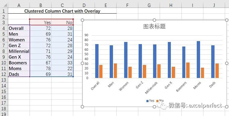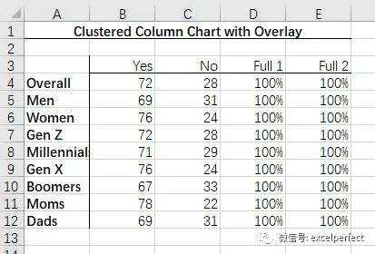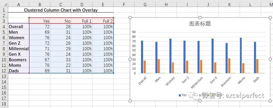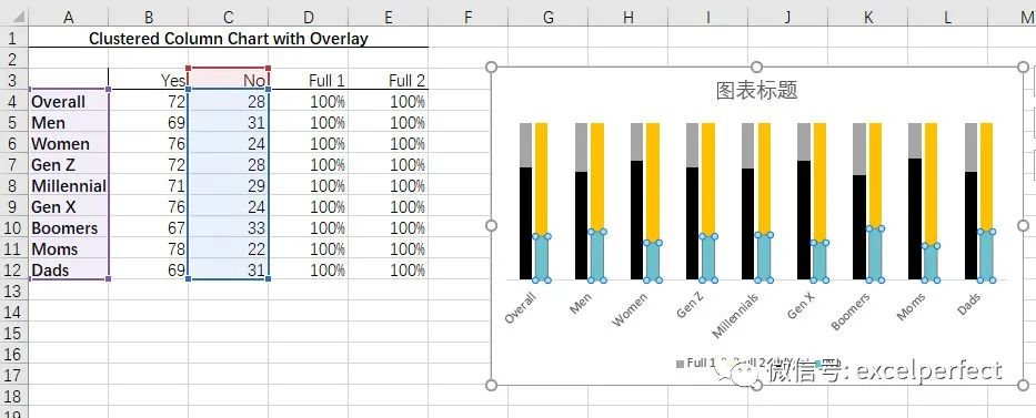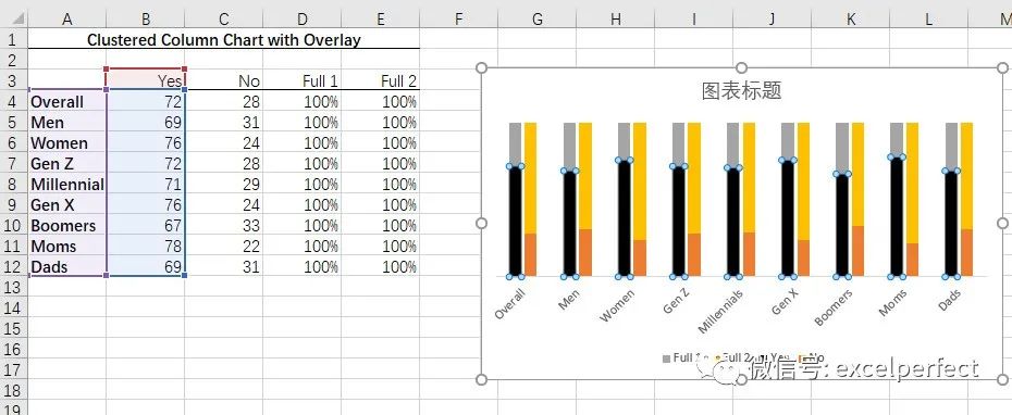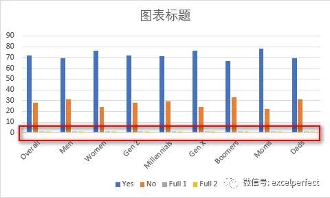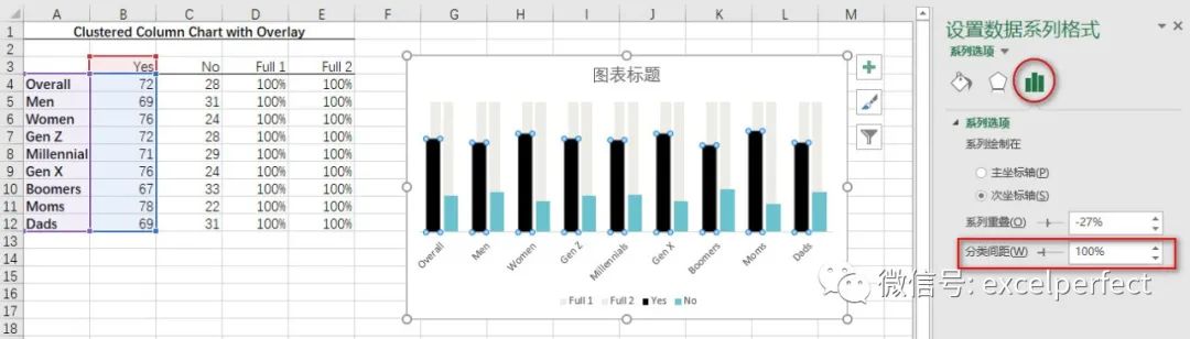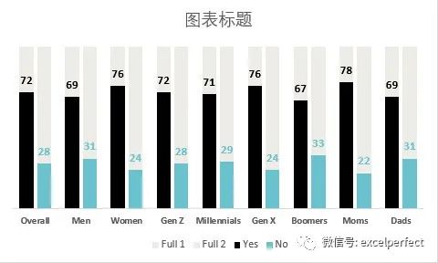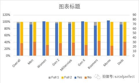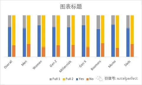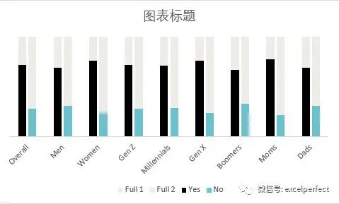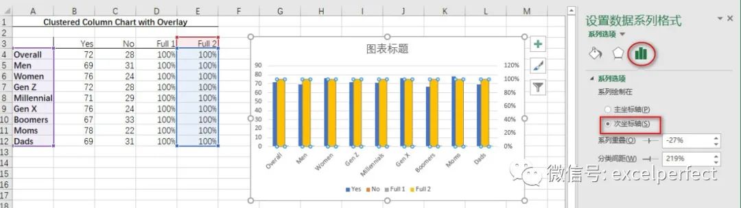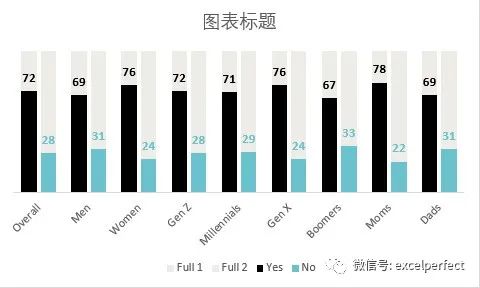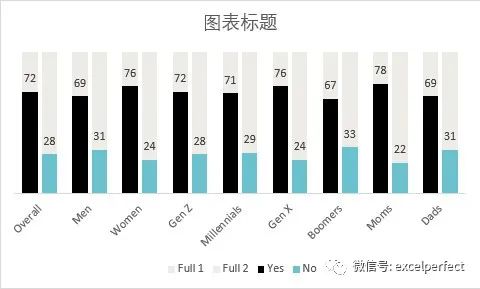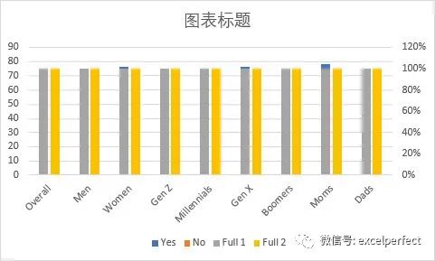 Excel 图表倾向于将次坐标轴数据放在主坐标轴数据的前面。因为我们需要表示100%的条形在后面,所以我们必须将“是/否”系列交换到次坐标轴,同时将“Full1/Full2”放置到主坐标轴。结果如下图9所示。