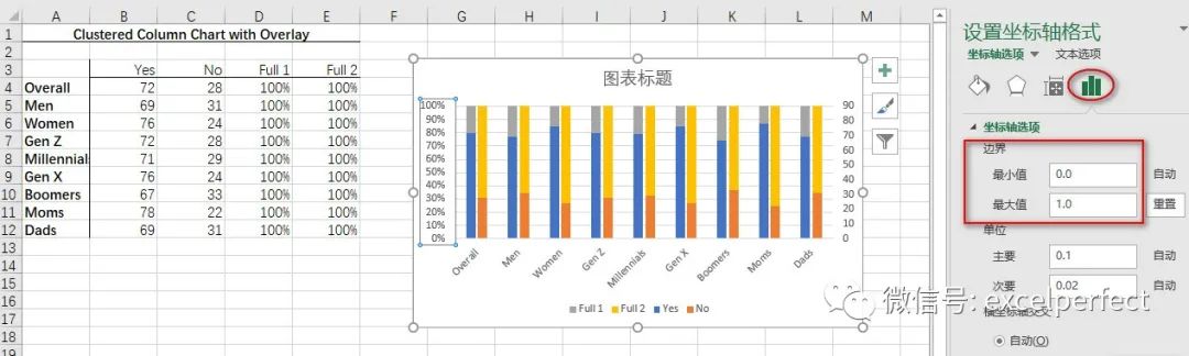 选择主坐标轴,然后设置坐标轴边界最小值=0,最大值=1(即100%)。