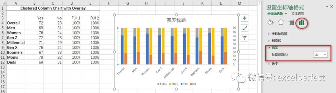 由于我们不需要在坐标轴旁看到百分比标签,因此可以设置标签位置为“无”,如下图11所示。