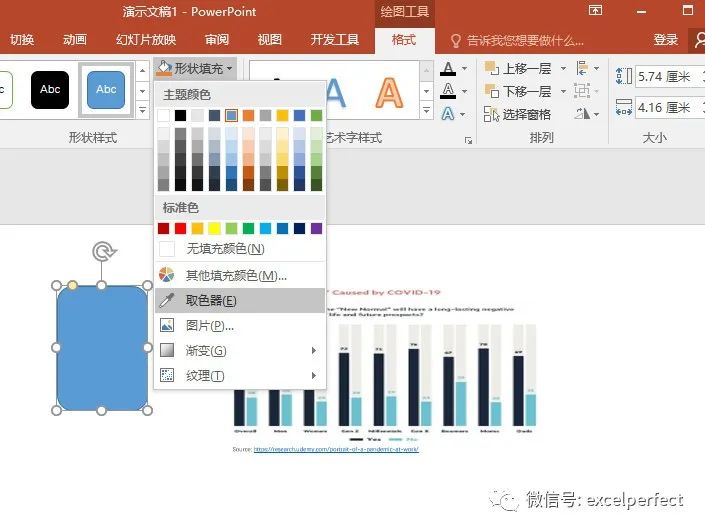 5. 选择形状,单击“绘图工具”选项卡“形状样式”组中的“形状填充—取色器”,如下图14所示。
