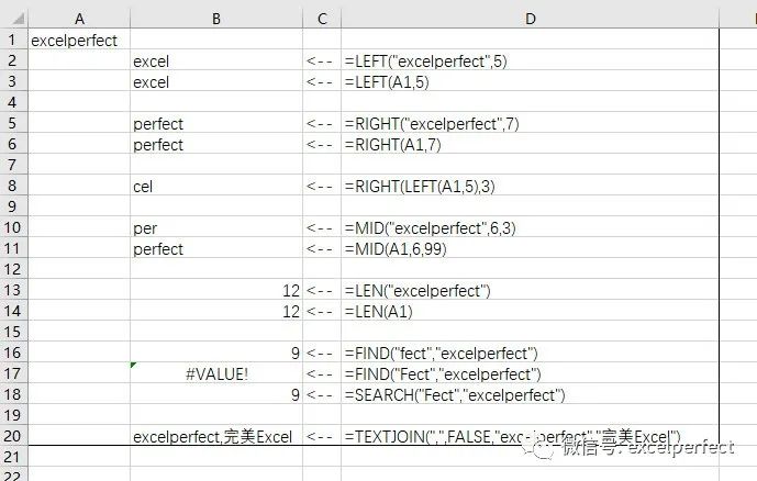 =TEXTJOIN(",",FALSE,"excelperfect","完美Excel")