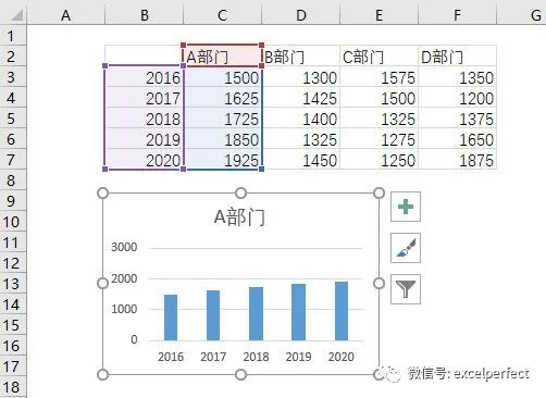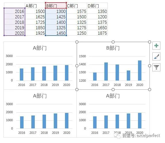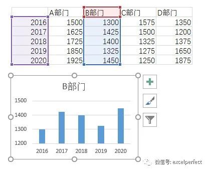 接着,将鼠标移至A部门所在的数据列,当光标变成十字方向箭头时,拖动使得红色和蓝色选择区域至B部门,图表也相应更新,如下图2所示。
