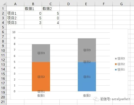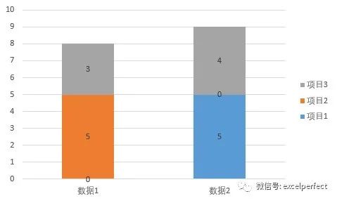 这里的问题是,具有零值的堆叠列数据点的高度为零,并且标签位于两侧的边界上。如下图1所示的图表,“项目3”系列的标签很好,但“项目2”系列中数据2和“项目1”系列中数据1的标签没有要标记的点。