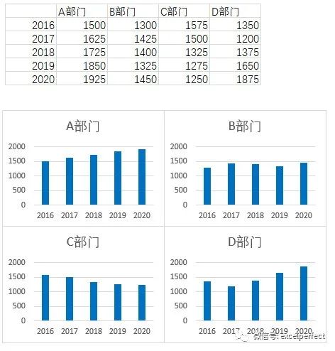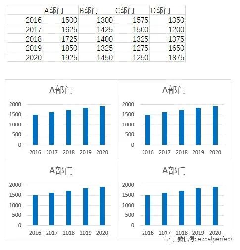 (4)更改复制的图表中的数据。每个图表显示自己部门的数据,如下图4所示。