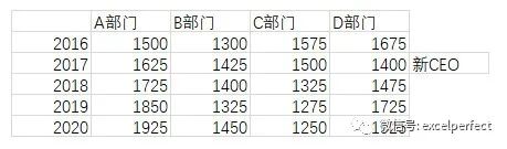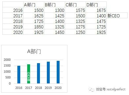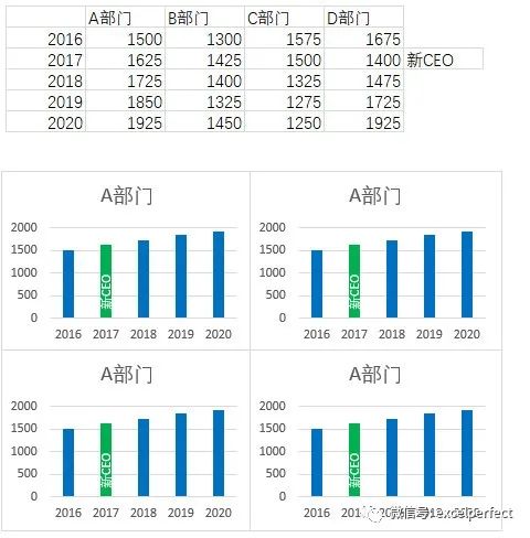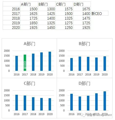 (2)创建第一个图表,并格式化。我们通过将数据点标记为“新CEO”并将柱形填充为绿色而不是默认的蓝色来突出显示新CEO的到来。