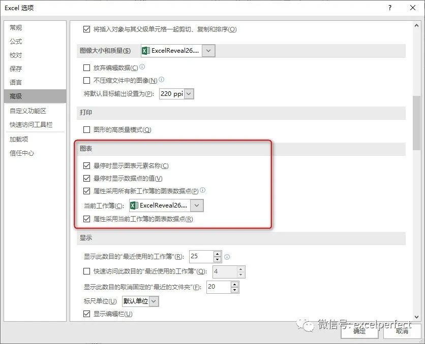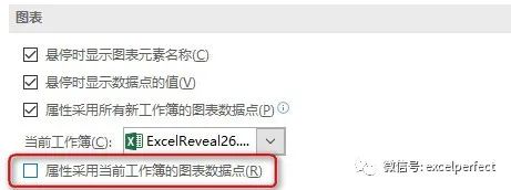 单击“文件”菜单,选择“选项”命令。在“Excel选项”对话框中,选择左侧的“高级”选项卡,在右侧找到“图表”部分,可以看到“属性采用所有新工作簿的图表数据点”和“属性采用当前工作簿的图表数据点”选项。