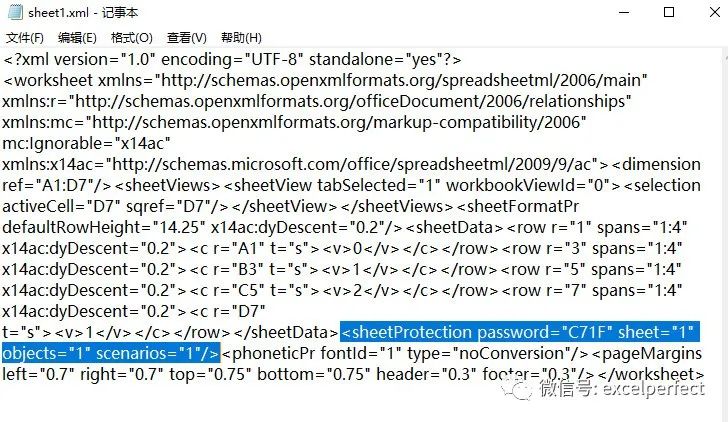 将sheet1.xml文件拖出来,使用记事本打开,找到<sheetProtectionpassword=… />,如下图5所示,将其删除。