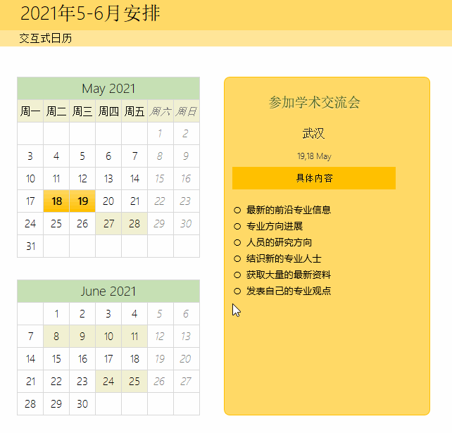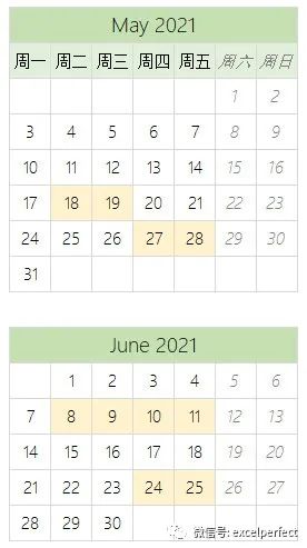 示例中,所有的事项都安排在2021年5月和6月,于是只需手动创建这两个月的日历,如下图3所示。