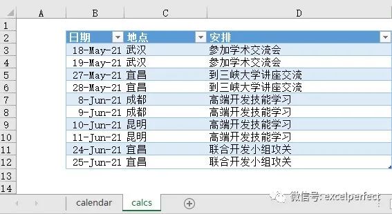 每件事有与之相关的4个详细信息:标题、日期、地点和详细情况描述。当用户选择日历中的日期时,显示事情的详情。由于所选的日期在“selectedCell”中,我们使用VLOOKUP、IF、IFERROR来完成: