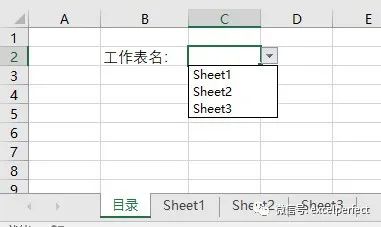代码中,遍历工作簿中所有工作表,将除“目录”工作表之外的工作表名称使用“,”连接成字符串。然后清除单元格C2中的内容并删除其中存在的任何有效性列表,并添加新的有效性列表。