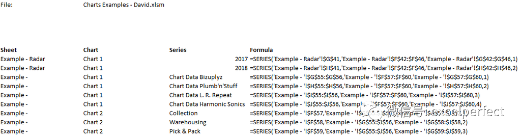 因此,对于每个系列,我们想要记录工作表名称、图表名称、它是什么系列以及用于获取该系列数据的公式。