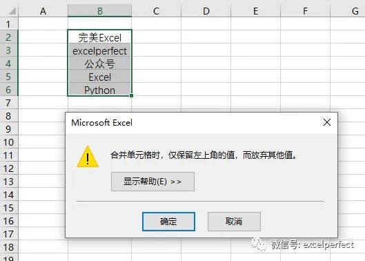 有时候,我们需要合并多个单元格,然而,当选择要合并的单元格,并使用“合并单元格”命令后,Excel会给出如下图1所示的提示,只保留左上角单元格中的数据。