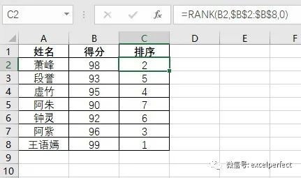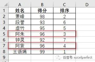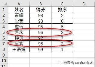 可以看出,使用RANK函数进行排序非常方便。然而,如果两人或多人的分数相同,此时RANK函数会给出并列排名的结果,如下图2所示。