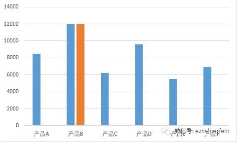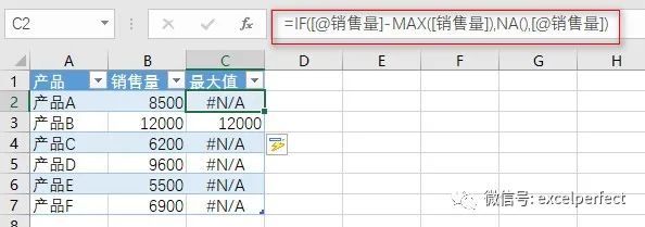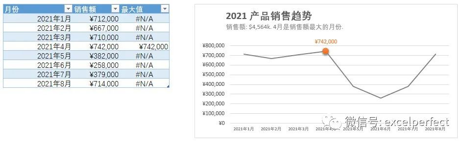 要突出显示Excel图表中的值,只需添加一个带有要突出显示的值的额外系列。假设想要突出显示销量最大的产品,添加一个额外的列来计算值,如下图3所示。