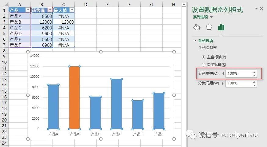 现在,将系列重叠设置为100%,突出显示最大值,如下图5所示。