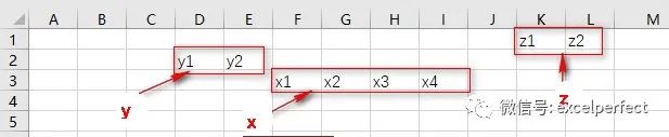 上述公式适合于3个区域都占2列的情形。然而,如果区域的长度不同呢。例如,下图2所示的数据,要转换成一维数组:{“x1”,”x2”,”x3”,”x4”,”y1”,”y2”,”z1”,”z2”}。