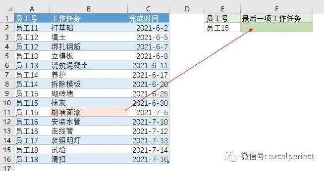 举个例子,如下图1所示的数据,要查找“员工15”的最后一项工作任务。