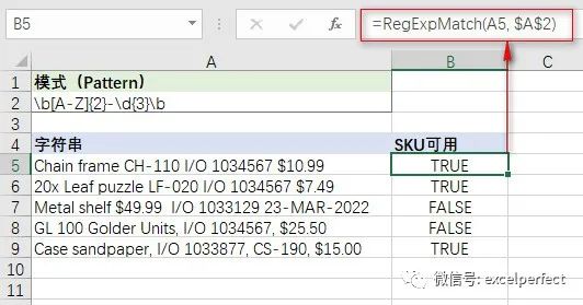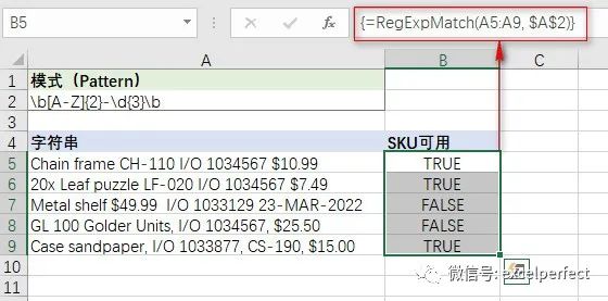 假设有一个单元格区域(A5:A9),其中包含有关某些项目的各种详细信息,想要知道哪些单元格含有SKU。假设每个SKU由2个大写字母、一个连字符和3个数字组成,可以使用以下表达式匹配它们。