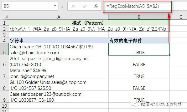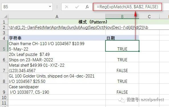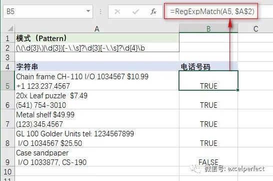 下面,介绍几个为演示目的而创建的正则表达式匹配示例。我们不能保证模式能够完美地处理真实工作表中更大范围的输入数据。在运用到正式工作表之前,确保根据需要测试和调整这些示例正则表达式。