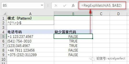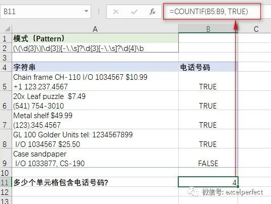 假设使用了一个正则表达式来匹配电话号码,并在列B中输出结果。要找出有多少单元格包含电话号码,只需要计算单元格区域B5:B9中的TRUE值。使用标准的COUNTIF公式可以很容易地做到这一点: