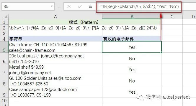 例如,如果单元格A5中的字符串包含有效的电子邮件地址,则返回“Yes”,否则为“No”。