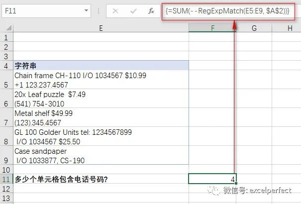 由于内置的Excel函数不支持正则表达式,因此无法将正则表达式直接放入COUNTIF或COUNTIFS函数中。幸运的是,可以使用我们的自定义函数模拟此功能。