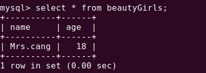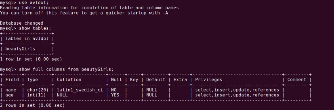 可以看到我们在这张表中创建了 name 和 age 这两个字段