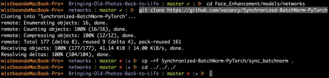 接着进入项目文件,进入 「Face_Enhancement/models/networks/」,把「Synchronized-BatchNorm-PyTorch」clone下来: