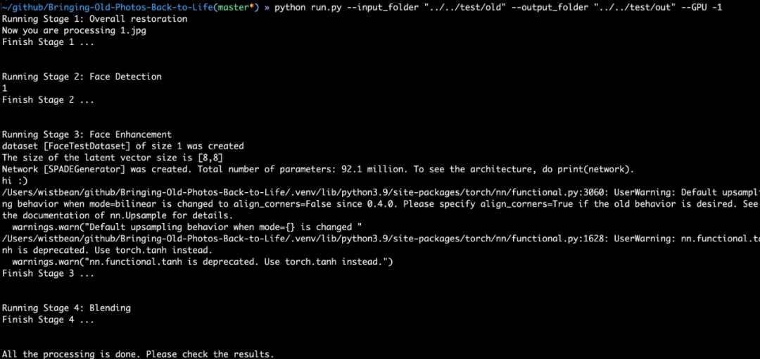 python run.py --inputfolder [旧照片的文件夹路径] --outputfolder [新照片的文件夹路径] --GPU 0 --with_scratch