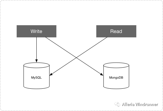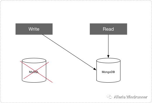 假设我们的数据要从MySQL迁移到MongoDB,那么我们直接双写MySQL和MongoDB即可,写多久呢?时效性多久我们就写多久。双写完成后,原数据库中的数据就已经过期了,我们直接干掉,然后读写新数据库就行了。示意图如下: