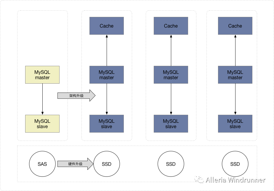 架构升级我们可以从简单的M-S架构到DB拆分架构,从无Cache到Cache,示意图如下: