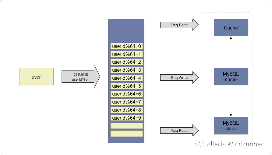 分表的策略也很简单,拿数据库的主键对分表数量做个哈希函数即可,然后应用层可以使用读写分离,写主库读缓存或者从库。当然这样也存在一些问题,首先是读写分离需要在应用层实现,然后是非partition key读写的问题。当数据量再大一点的时候我们的架构可以继续进行升级,例如我们对之前拆分过的用户库继续进行垂直拆分,示意图如下:
