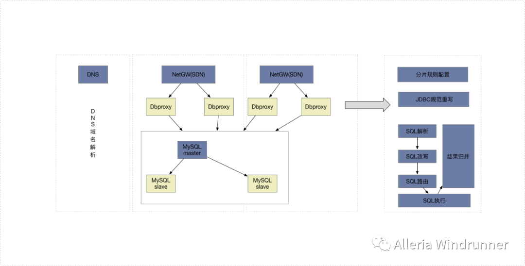 最最简单的一个问题就是我们的业务逻辑层需要引入Sharding-JDBC(Sphere)组件,架构层面就带来了耦合性。那这个问题我们怎么解决呢?最直接的想法就是将Sharding-JDBC组件抽出来变成一个进程,示意图如下: