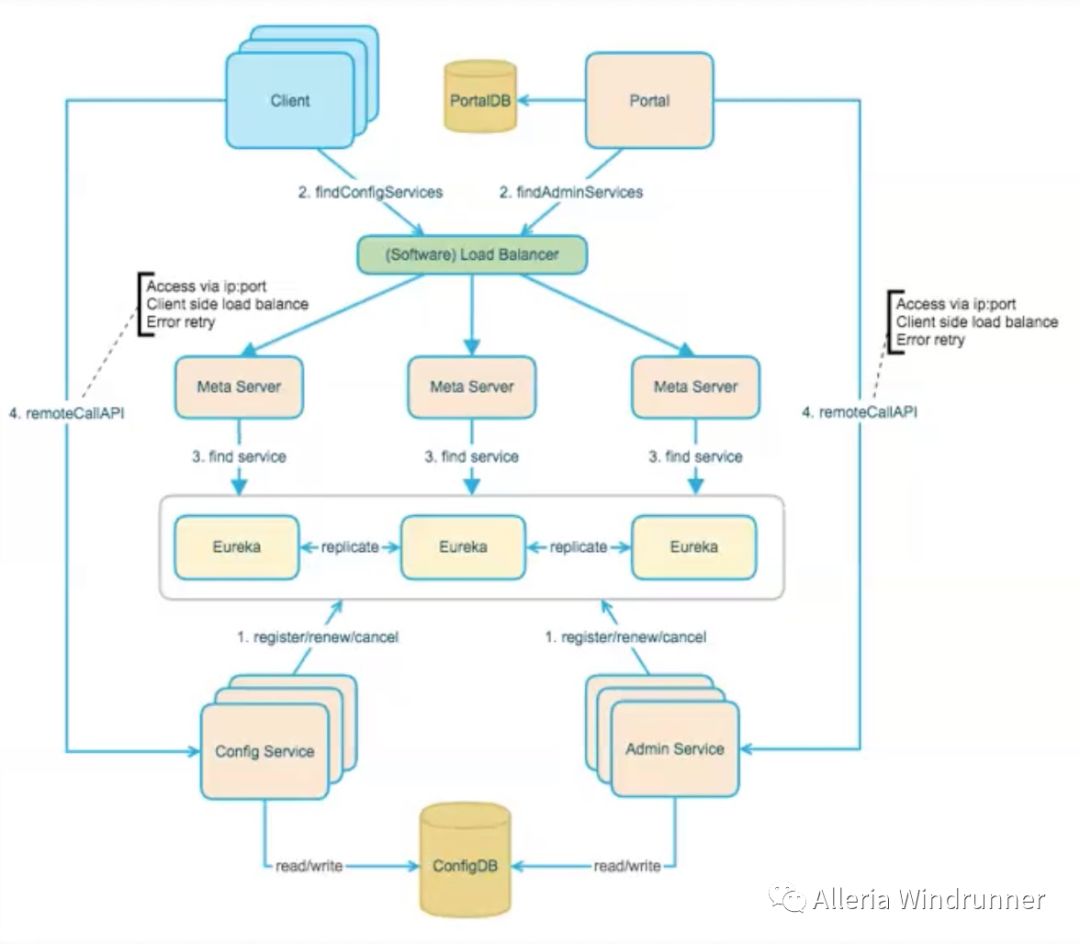 * Config Service提供配置的读取、推送等功能、服务对象是Apollo客户端。* Admin Service提供配置的修改、发布等功能,服务对象是Apollo客户端。* Config Service和Admin Service都是多实例、无状态部署,所以需要将自己注册到Eureka中并保持心跳。* 在Eureka之上有一层Meta Server用户封装Eureka的服务发现接口。* Client通过域名访问Meta Server获取Config Service服务列表(IP+Port),然后直接通过IP+Port访问服务,同时在Client侧会做load balance、错误重试。* Portal通过域名访问Meta Server获取Admin Service服务列表(IP+Port),而后直接通过IP+Port访问服务,同时在Portal侧会做load balance、错误重试。* Apollo为了简化部署,实际上会把Config Service、Eureka和Meta Server三个逻辑角色部署在同一个JVM进程中。
