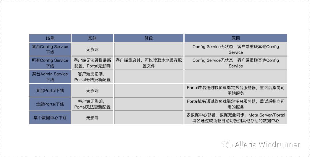 配置中心作为基础服务,可用性要求非常高,下面的表格描述了不同场景下Apollo的可用性:
