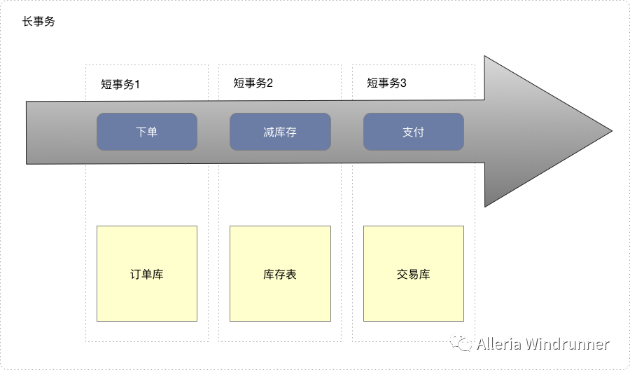 有两类情况会出现,第一类就是下单、减库存、支付都成功,那分布式事务就成功。第二类就是下单、减库存成功,支付失败,那我们就需要对下单和减库存做补偿处理。这个例子中我们就把下单、减库存、支付这个长的分布式事务转换为了多个短事务,最后如果是有失败的步骤我们的补偿处理就是解决思路里面的协调。示意图如下: