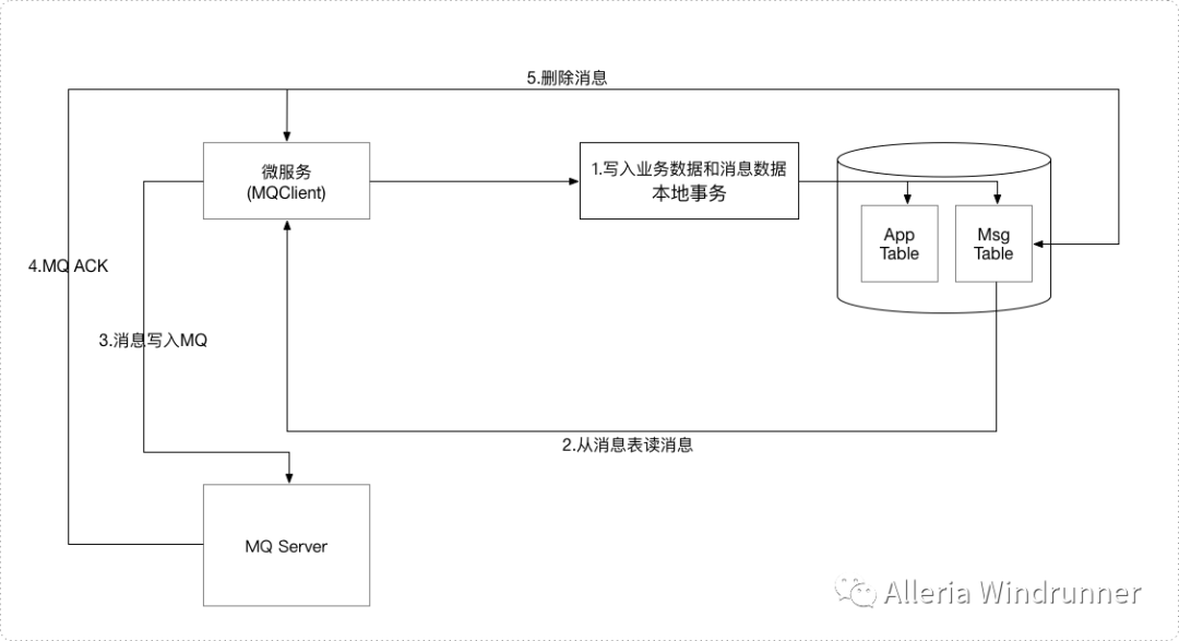 异步场景下处理分布式消息的另外一种常用方案就是本地事务消息表,其示意图如下: