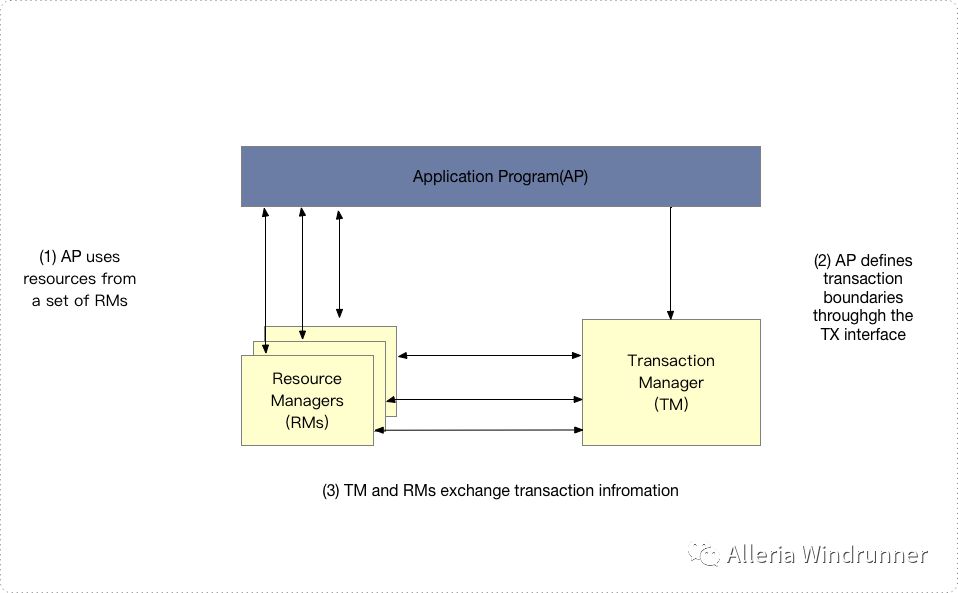 XA是X/Open CAE Specification(Distributed Transaction Processing)模型中定义,XA规范由AP、RM、TM组成。其中应用程序(Application Program,简称AP):AP定义了事务边界(定义事务开始和结束)并访问事务边界内的资源。资源管理器(Resource Manager,简称RM):RM管理计算机共享的资源,资源即数据库等。事务管理器(Transaction Manager,简称TM):负责管理全局事务,分配事务唯一标识,监控事务的执行进度,并负责事务的提交、回滚、失败恢复等。示意图如下: