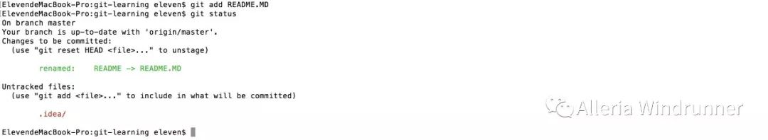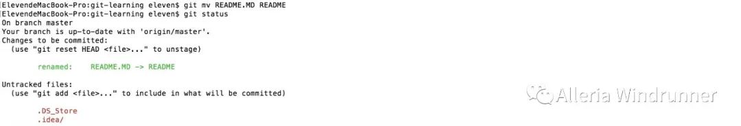 我们可以看到通过此种方式是先删除了原文件然后再添加了一个新文件,其实Git为我们提供了重命名文件的方法git mv [\<options>] \<source>... \<destination>,我们还是在之前的示例工程中做演示。工程的Github地址为https://github.com/AlleriaWindrunner/git-learning.git。假如我们想把文件名又改回README,这次我们使用git mv命令。
