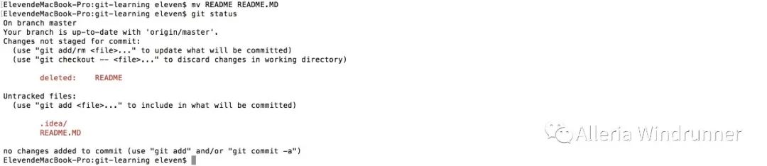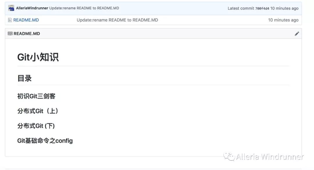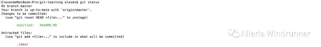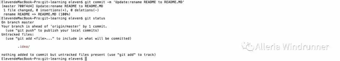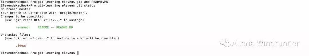 首先我们来美化一下目录,GitHub默认是支持markdown文件格式的,我们把README文件名改成README.MD。我们查看下工作目录下文件的状态: