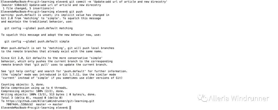 确认本次修改集的内容都添加到暂存区之后我们再执行git commit命令提交到版本库并推送到远程仓库: