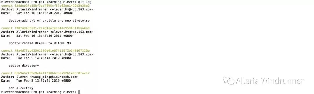 不知道你有没有注意,第一次我美化完目录后就直接add、commit、push,第二次添加链接和补全目录时由于忘记了补全目录我先把链接的变更添加到暂存区,然后再次修改后又执行了git add命令把新的变更再次添加到了暂存区,最后执行了commit、push命令,这个地方很多刚开始用 Git的小伙伴都有一个不好的习惯就是没有做好暂存区变更集合的检查就执行git commit从而导致commit次数太多,所以特意提出来让大家注意下,Git的每次提交尽量是一个变更集噢,不然你的提交记录会很混乱。你可以执行git log来查看你的commit纪录: